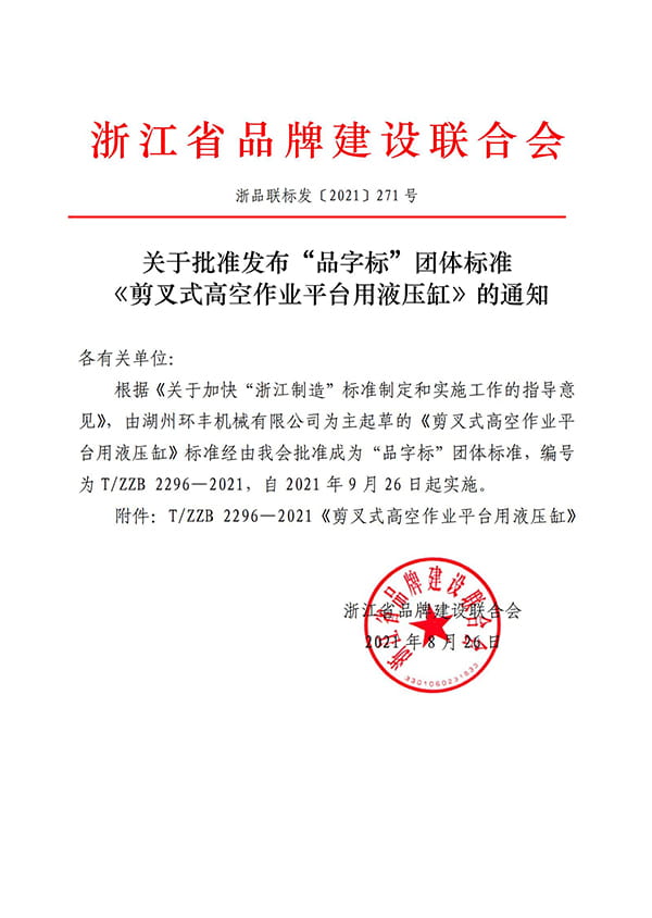 Makas Fork Havalı Çalışma Platformları için “Pinyibiao” Grup Standart “Hidrolik Silindirin Yayınlanmasının Onayı Hakkında Bildirim